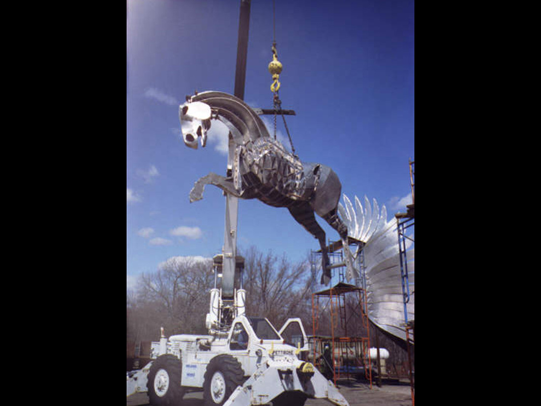 Forming presented a considerable challenge. The models in eighth or quarter scale were the only source of information regarding how much the elements were to be formed. Bloomer’s studio scaled the models and developed rolling and forming templates for Welding Works to use. A trial and error method was generally employed in arriving at the finished look of each shape. Once the shape was developed, Welding Works used a press brake, as well as two rolling machines. The horse was the most time-consuming element of the sculpture, due to the many pieces requiring hand forming. There are over 400 pieces on the skin alone, and another 300 pieces were used to fabricate the body of the horse.