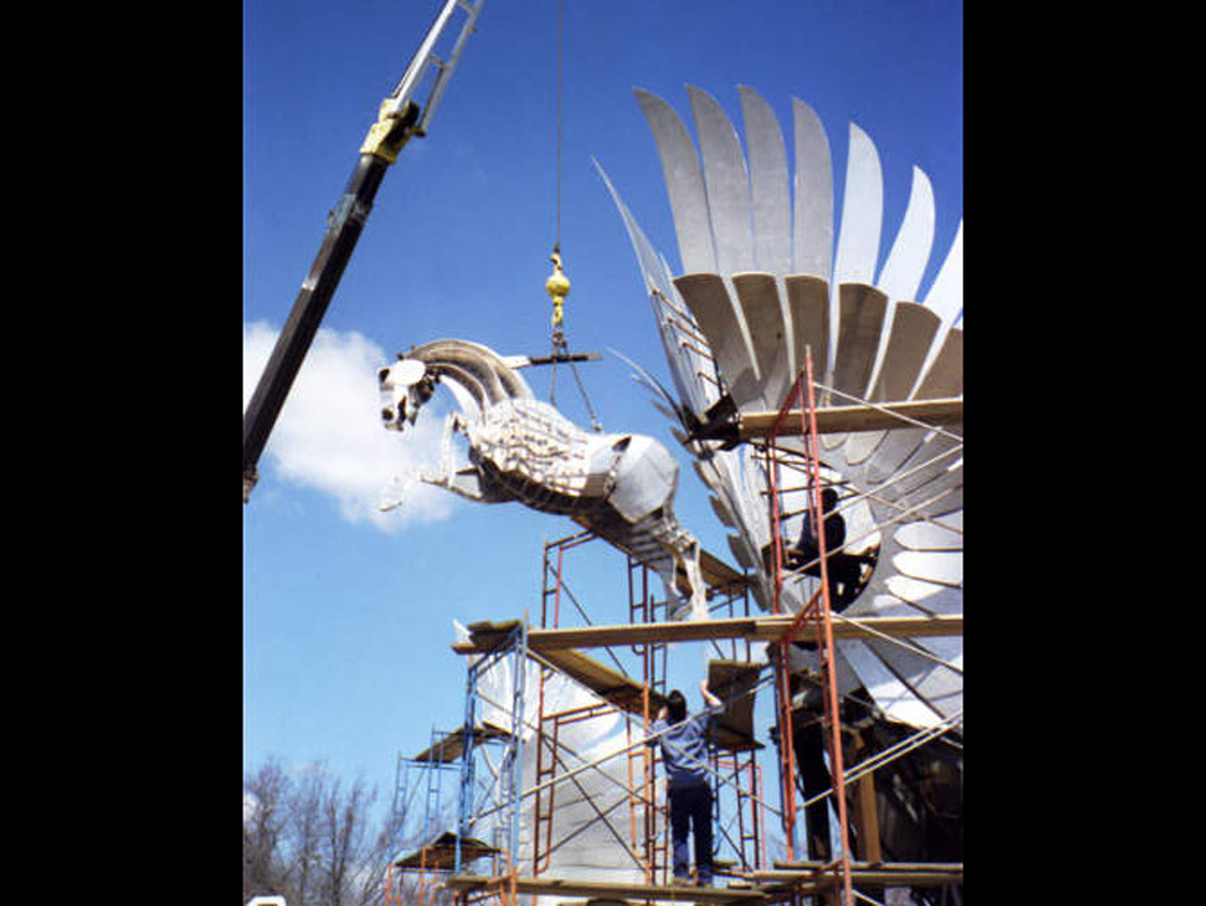 Welding Works’ role in this ambitious undertaking was the fabrication of the symbolic exterior ornamentation for the structure. Designed by Kent Bloomer, the ornamentation includes two sets of 25-foot-high aluminum wings which are mounted atop the north and south towers of the Archway. Wings were chosen by Bloomer to symbolize movement, transportation and communication. An aluminum horse leaps out of one set of wings, representing the Pony Express. All aluminum plate ornaments were cleaned and left in their natural finish. Supporting the ornaments are approximately six tons of sandblasted and painted structural steel, also fabricated by Welding Works.