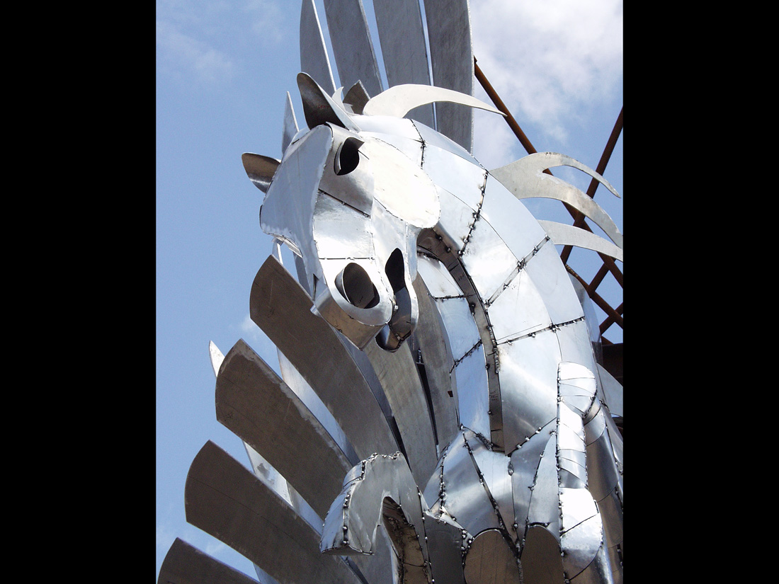 Forming presented a considerable challenge. The models in eighth or quarter scale were the only source of information regarding how much the elements were to be formed. Bloomer’s studio scaled the models and developed rolling and forming templates for Welding Works to use. A trial and error method was generally employed in arriving at the finished look of each shape. Once the shape was developed, Welding Works used a press brake, as well as two rolling machines. The horse was the most time-consuming element of the sculpture, due to the many pieces requiring hand forming. There are over 400 pieces on the skin alone, and another 300 pieces were used to fabricate the body of the horse.