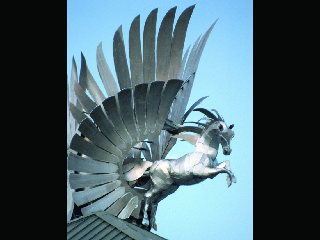 Welding Works’ role in this ambitious undertaking was the fabrication of the symbolic exterior ornamentation for the structure. Designed by Kent Bloomer, the ornamentation includes two sets of 25-foot-high aluminum wings which are mounted atop the north and south towers of the Archway. Wings were chosen by Bloomer to symbolize movement, transportation and communication. An aluminum horse leaps out of one set of wings, representing the Pony Express. All aluminum plate ornaments were cleaned and left in their natural finish. Supporting the ornaments are approximately six tons of sandblasted and painted structural steel, also fabricated by Welding Works.