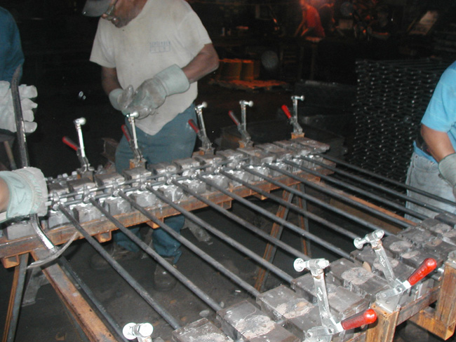 Since this project had to be true to the original 1862 fence, no fasteners, pins or welds could be visible. The new panels were to be of welded construction, and this posed one of the project’s biggest challenges – developing the manufacturing methods to cast around the weldment in a cost-effective, productive manner. To ensure that the mold would fit snug at each union for dead-on castings, the first step was to create precise assembly fixtures for accuracy. The weldments needed to be ±.15 inches to guarantee that the castings would be correct. The weld fixture held the steel posts in place with pneumatic clamps and enabled two workers to weld at the same time.