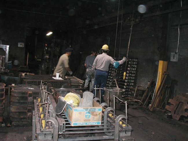 Since this project had to be true to the original 1862 fence, no fasteners, pins or welds could be visible. The new panels were to be of welded construction, and this posed one of the project’s biggest challenges – developing the manufacturing methods to cast around the weldment in a cost-effective, productive manner. To ensure that the mold would fit snug at each union for dead-on castings, the first step was to create precise assembly fixtures for accuracy. The weldments needed to be ±.15 inches to guarantee that the castings would be correct. The weld fixture held the steel posts in place with pneumatic clamps and enabled two workers to weld at the same time.