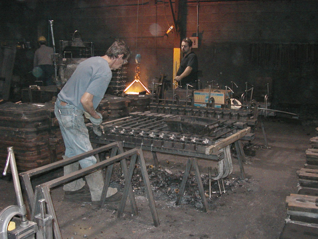 Since this project had to be true to the original 1862 fence, no fasteners, pins or welds could be visible. The new panels were to be of welded construction, and this posed one of the project’s biggest challenges – developing the manufacturing methods to cast around the weldment in a cost-effective, productive manner. To ensure that the mold would fit snug at each union for dead-on castings, the first step was to create precise assembly fixtures for accuracy. The weldments needed to be ±.15 inches to guarantee that the castings would be correct. The weld fixture held the steel posts in place with pneumatic clamps and enabled two workers to weld at the same time.